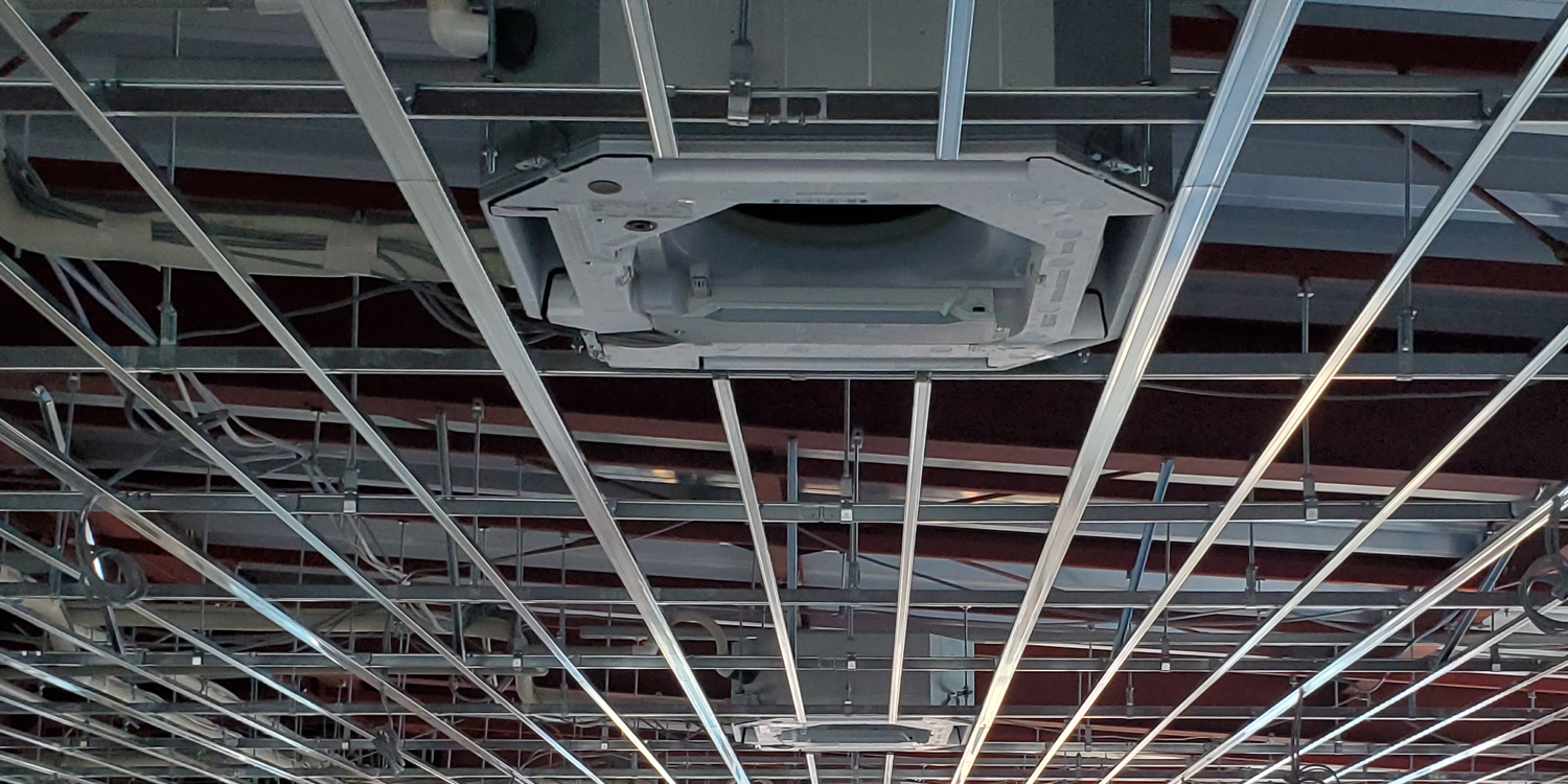 店舗や事務所など、ビルの建物内部の天井や壁に軽量鉄骨下地または軽鉄・軽天を使用した工事です。